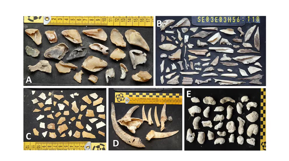 Ištyrus 12 lizdų, buvo rasta įvairių daiktų: 86 kanopos, daugiau nei 2100 kaulų ir senovinių paukščių kiaušinių lukštų fragmentų. Taip pat buvo rasta žmonių dirbinių, įskaitant tekstilės gaminius ir įrankius.