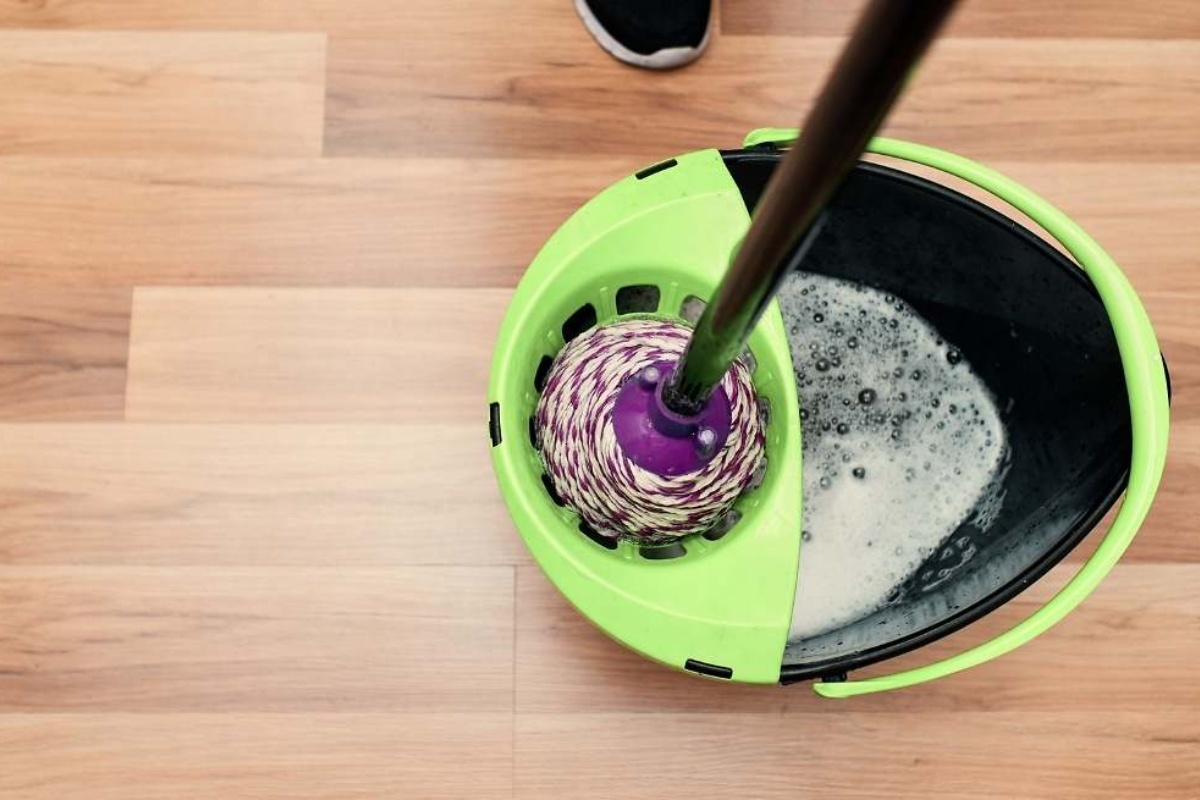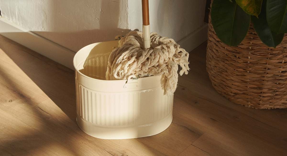 Medinės grindys kaip naujos vienu kartu: naminis mišinys šluotos kibire, kad jos būtų švarios ir blizgios.