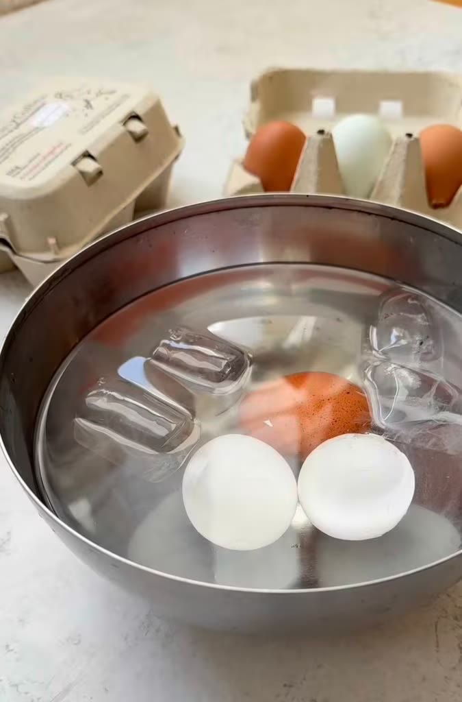 5. Išimkite kiaušinius iš puodo ir perkelkite juos į dubenį su šaltu vandeniu ir ledu, kad jie nustotų virti ir greičiau atvėstų.