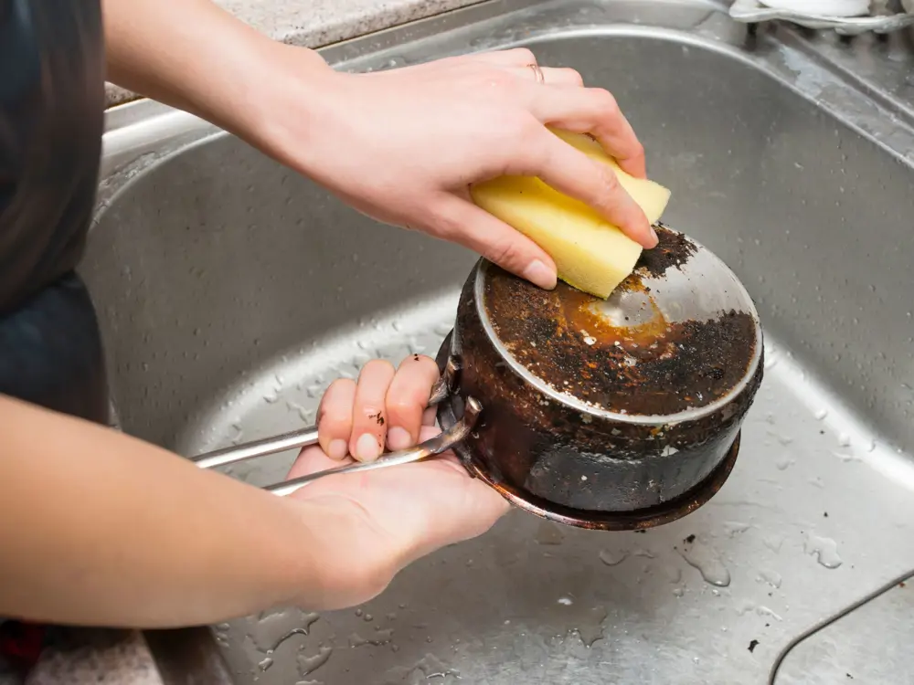 4. Norėdami pašalinti prilipusius nešvarumus nuo puodų ir keptuvės