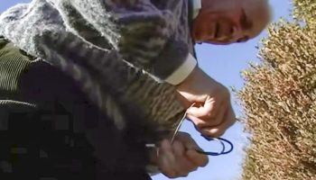 Ūkininkas senelis demonstruoja veiksmingą triuką, kuris praeityje buvo naudojamas daržams apsaugoti nuo pelių.
