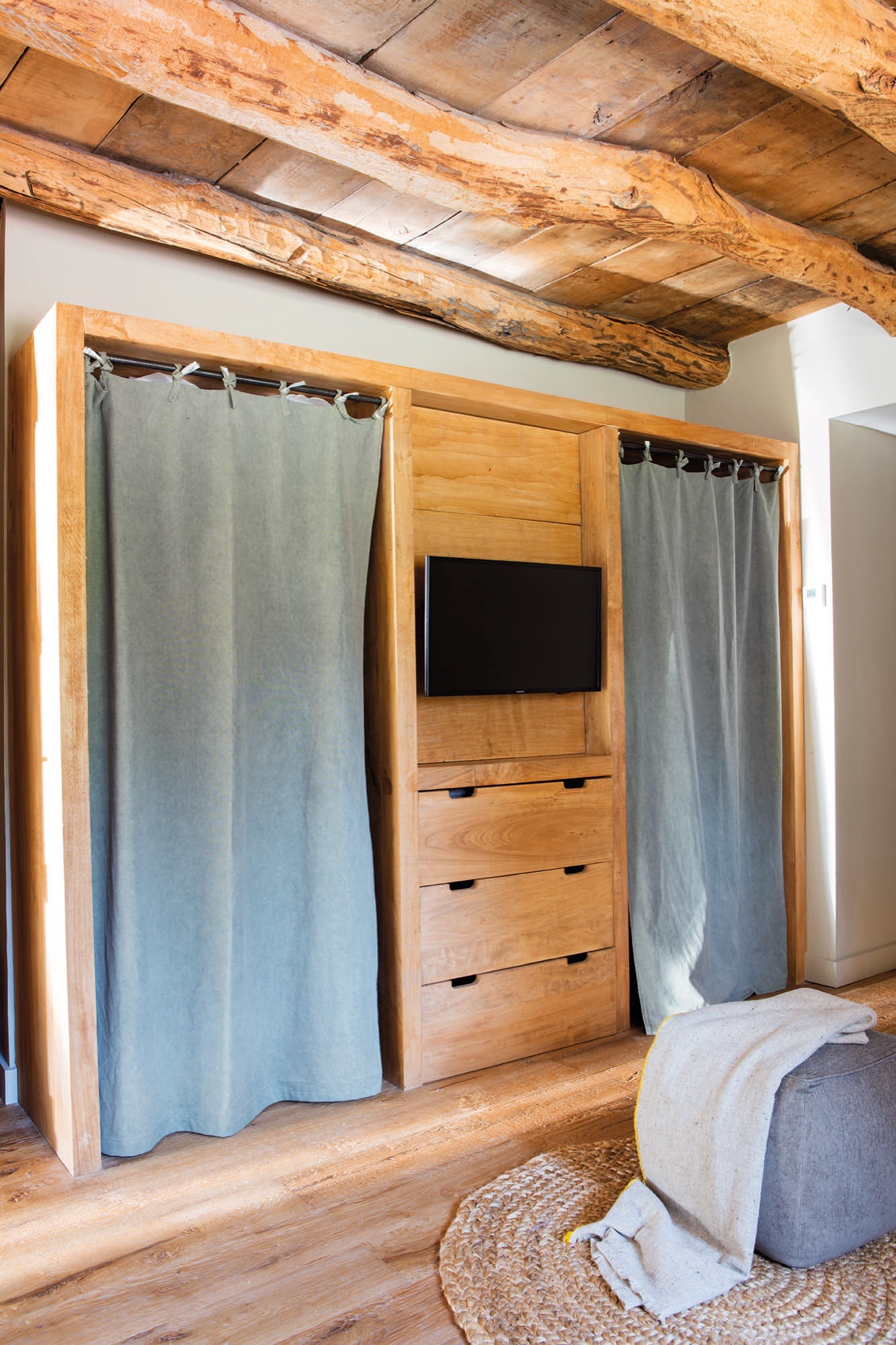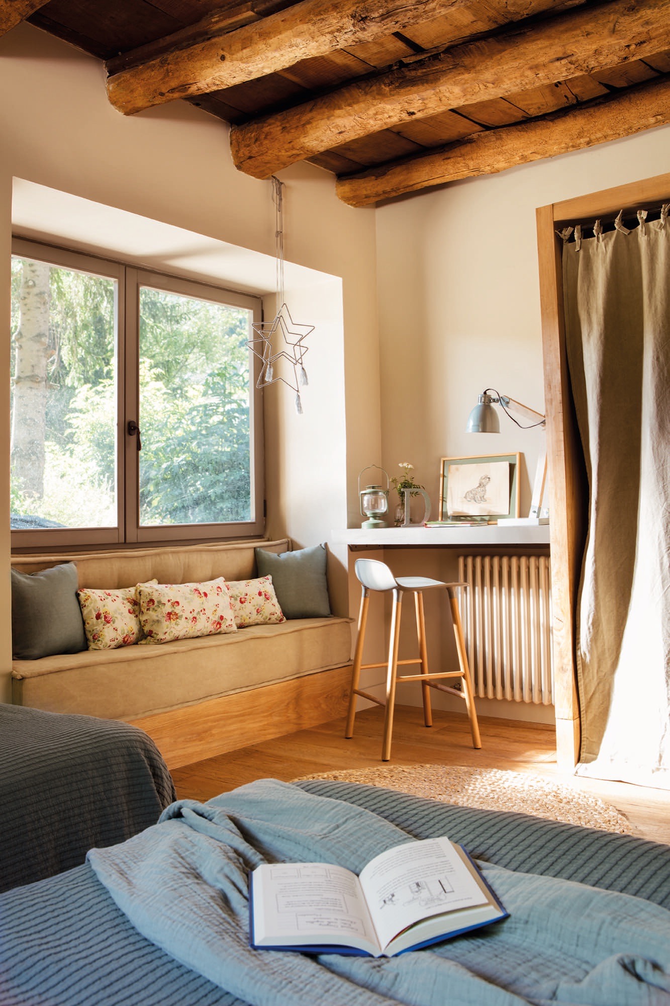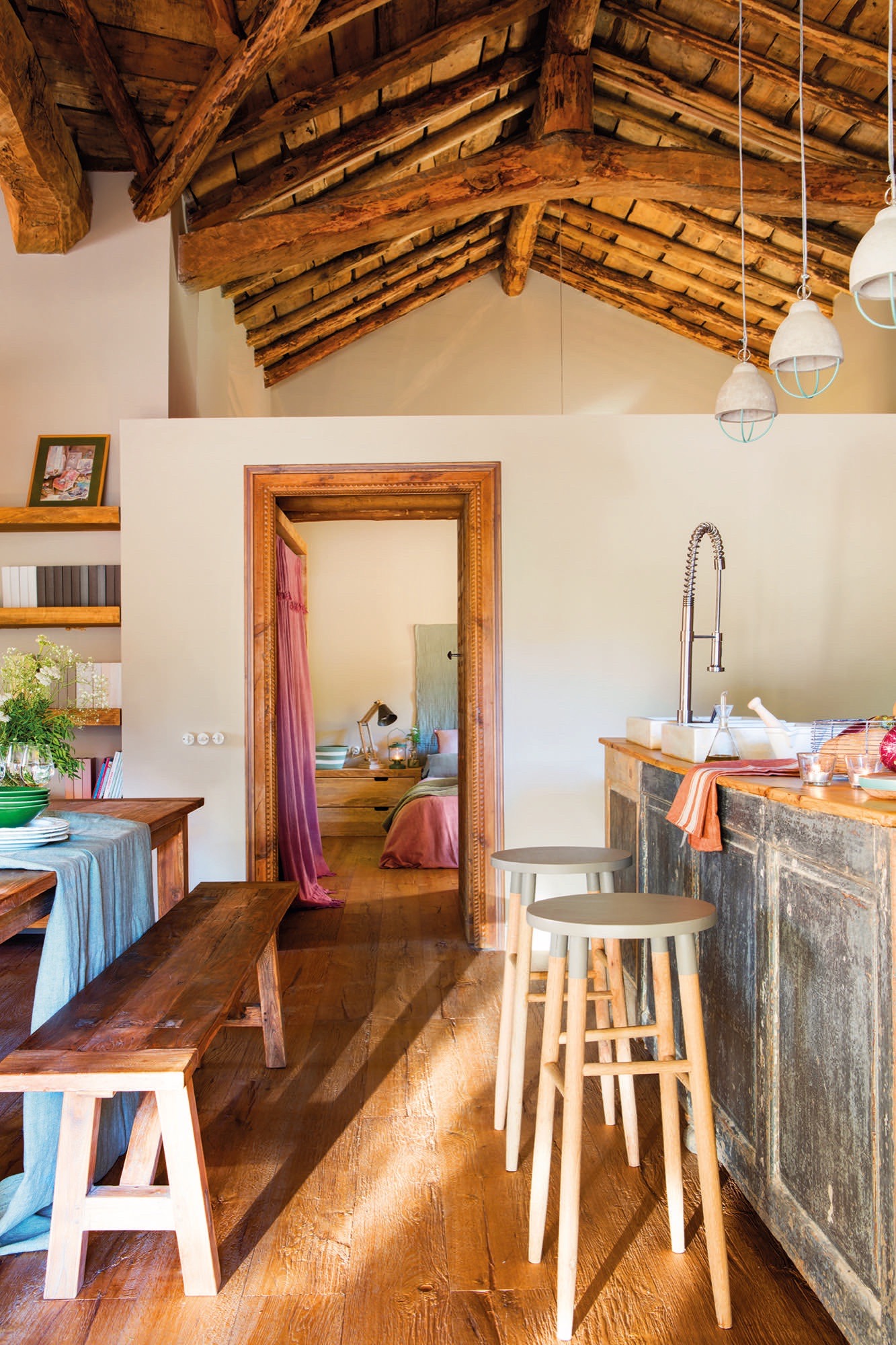 Jie nežinojo, kokios yra lubos, kol nepradėjo darbų. Ir nusprendė jas palikti, o tai nulėmė namo stilių. „Kai jį nusipirkome, lubos buvo uždengtos ir buvo daugiau pertvarų. Atsižvelgdamas į borda (Pirenėjuose naudojamas pavadinimas pastatui, kuriame laikomi gyvuliai ar jų pašaras) statybos metus, įsivaizdavau, kad bus atidengtos medinės lubos, bet nežinojau, kokios jos bus“, – aiškina savininkas.