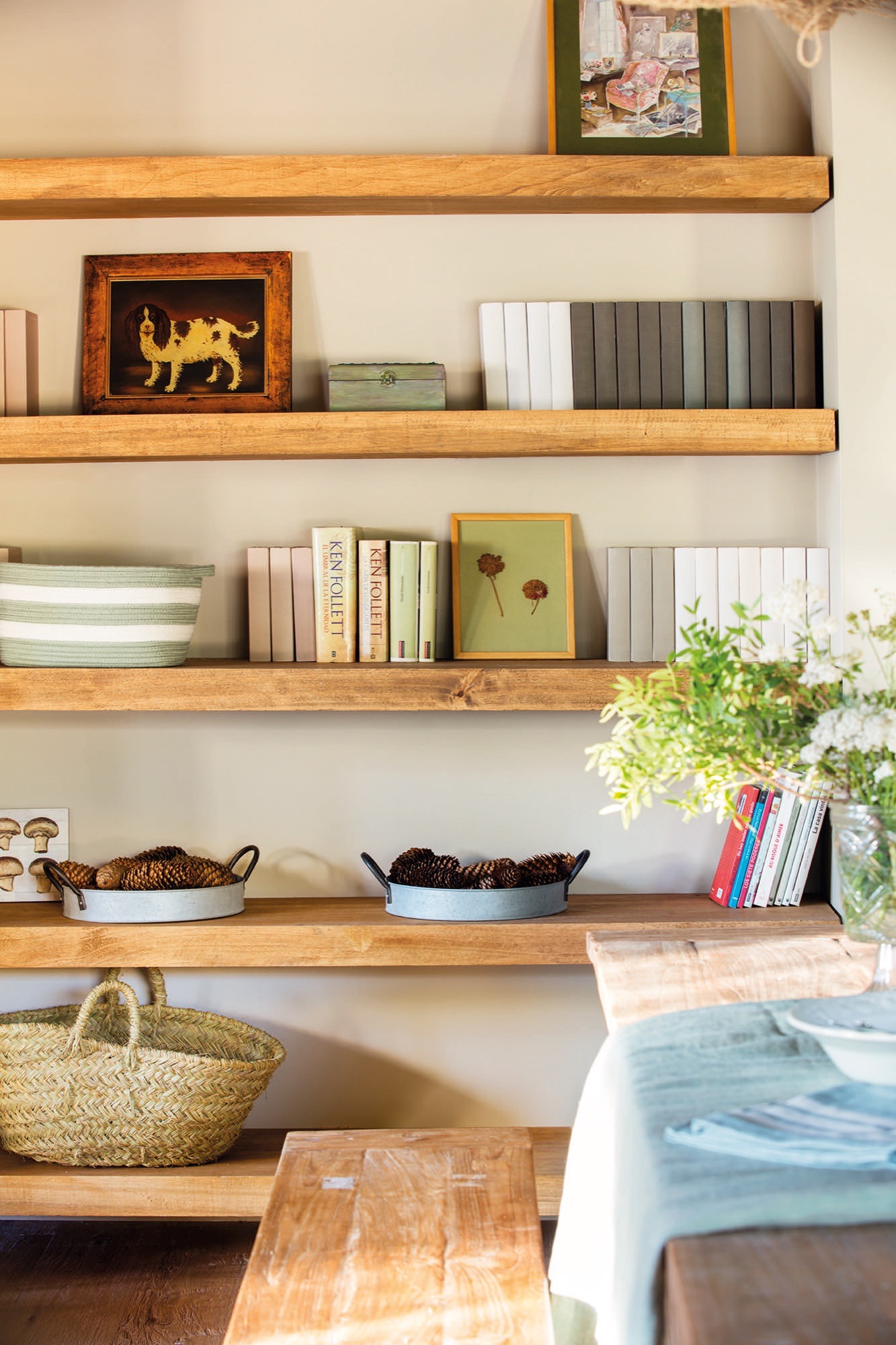 Mónica paprašė staliaus pagaminti keletą lentynų nuo sienos iki sienos. „Noriu, kad jos būtų kaip lentos, nieko nešlifuokite, palikite medį tokį, koks yra“, – pasakė ji statybininkui apie lentynų storį, o jis nustebo: „Dar daugiau?“ Taip, dar daugiau! Tokios storos ir gražios jos ir tapo.
