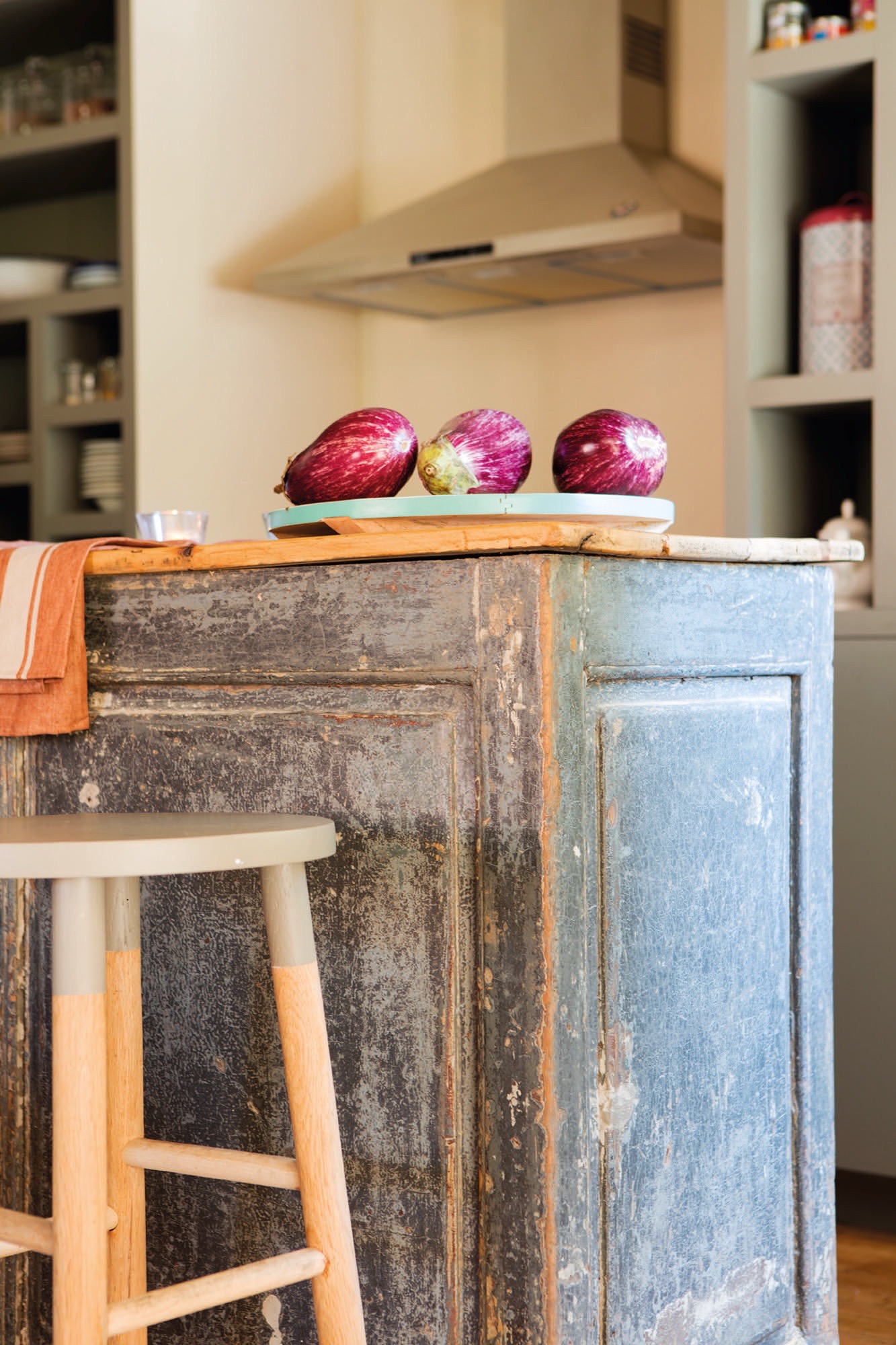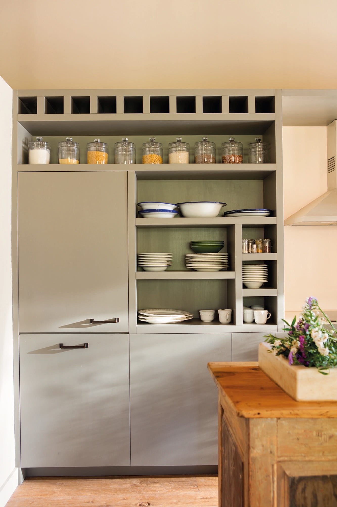 „Virtuvės spintelei pasirinkau Gabi Conde dizainą su nereguliariomis lentynėlėmis ir butelių laikikliu viršuje, ir mes ją nudažėme“, – sako Monica. Joje yra vietos viskam: nuo atvirų lentynų, kurios palengvina bendrą vaizdą, iki dailylenčių, kurios paslepia spinteles ir prietaisus.