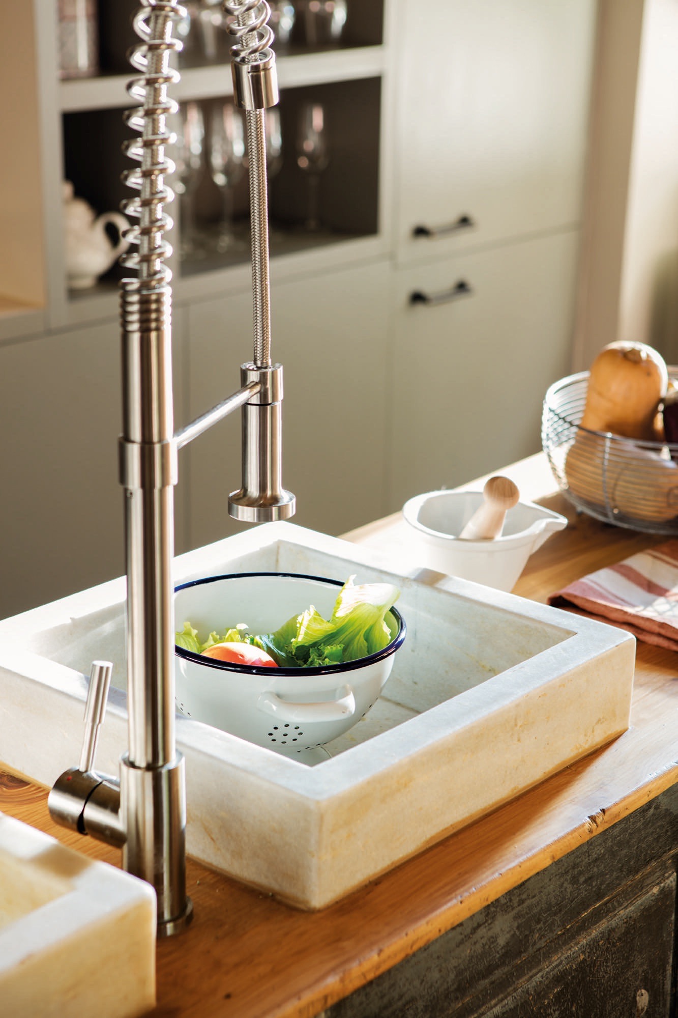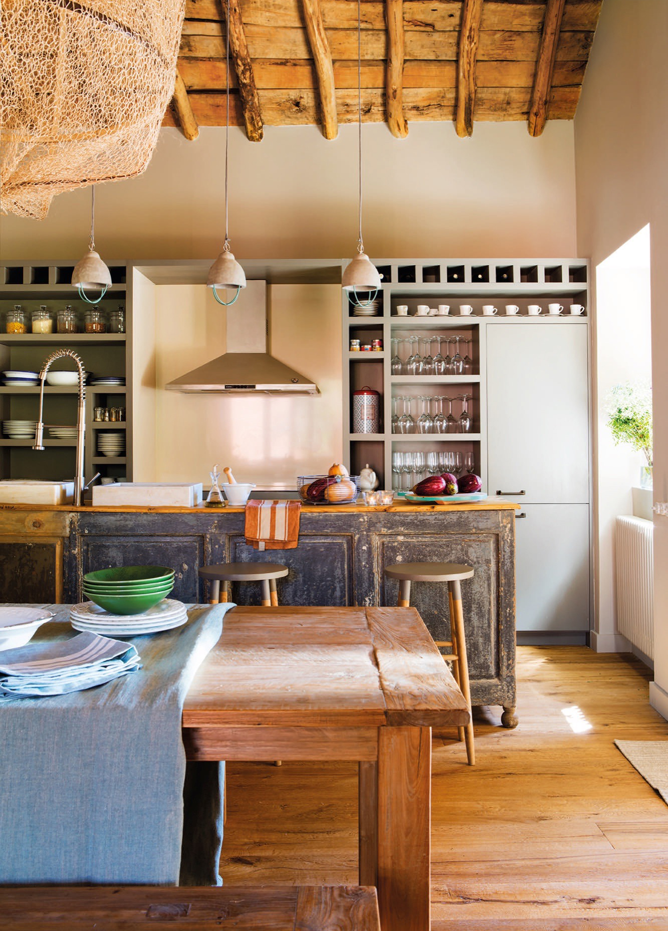 Stalas, suolas ir antikvarinis stalas, naudojamas kaip sala, visi iš „Merc&Cía“. Čiaupas iš „Grohe“. Taburetės iš „Natura Casa“. Lubų šviestuvai iš „Mio de Palafrugell“. Virtuvės baldai, pagaminti pagal užsakymą.