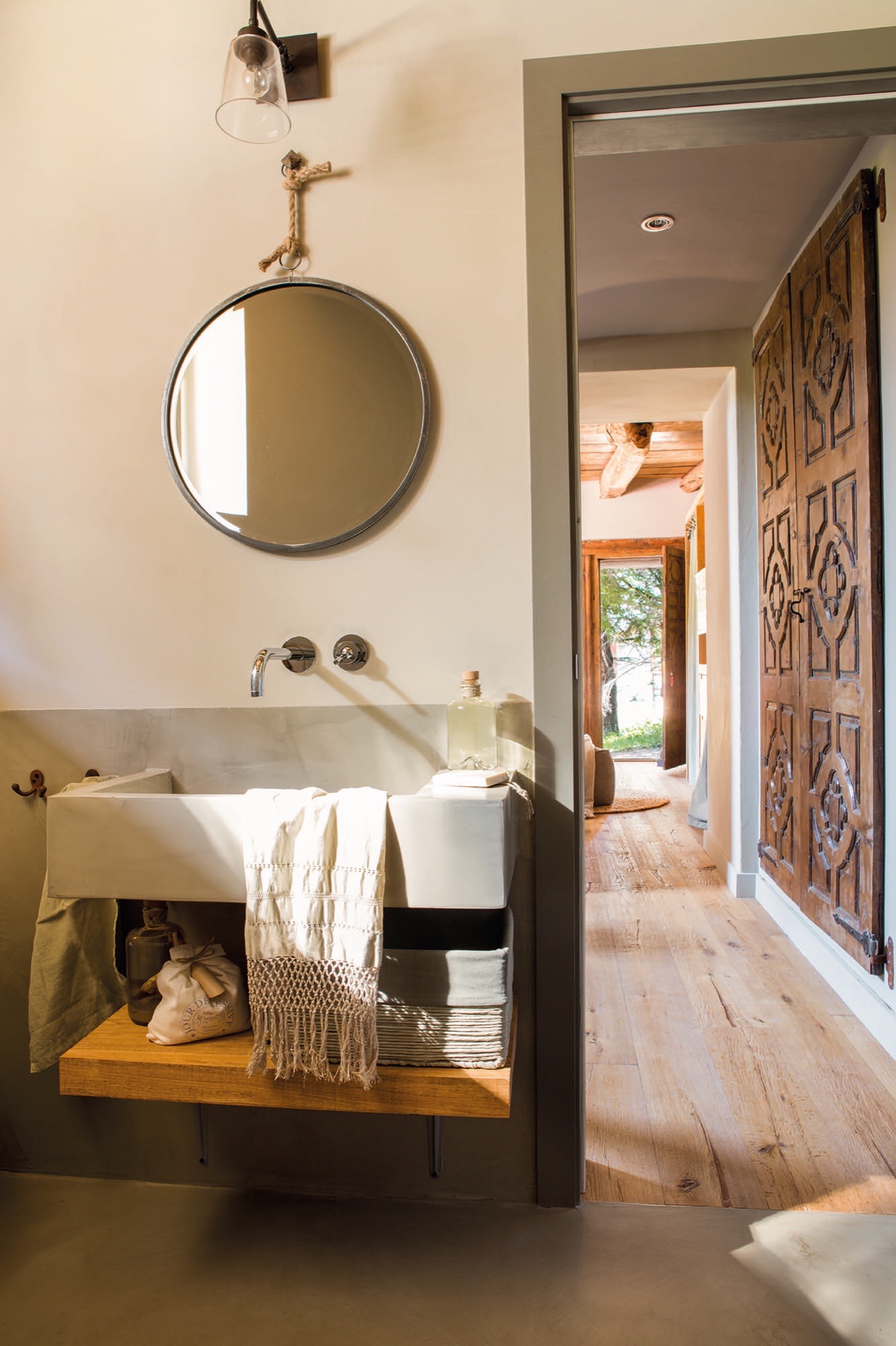 Vonios kambariai buvo lemiamas veiksnys namo spalvų pasirinkimui. Skamba keistai, bet Monica turi daug idėjų (kai kurias iš jų galima pamatyti EL MUEBLE) ir ji buvo labai aiški, kad jos bus pagamintos iš dažyto betono. „Aš ieškojau chaki pilkos spalvos, ir kai man pateikė galutinį atspalvį, mes jį panaudojome medžio dirbinių spalvai pasirinkti“, – sako ji. Nes „aš taip pat žinojau, kad dažysiu medžio dirbinius, nes namuose jau yra daug medžio, ir nenorėjau, kad jis atrodytų pernelyg perkrautas“.