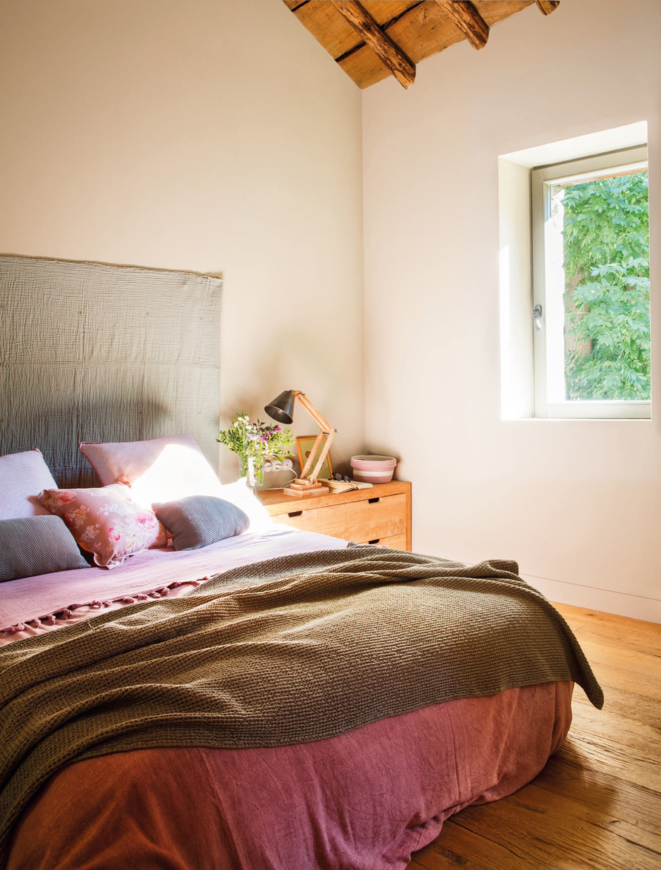 Nors pilkai mėlynos medienos derinys yra laimėjęs derinys visame name, miegamajame taip pat yra pudros rožinės spalvos patalynė, kuri sušvelnina derinį ir suteikia šilumos, kurią pabrėžia lininis galvūgalis.