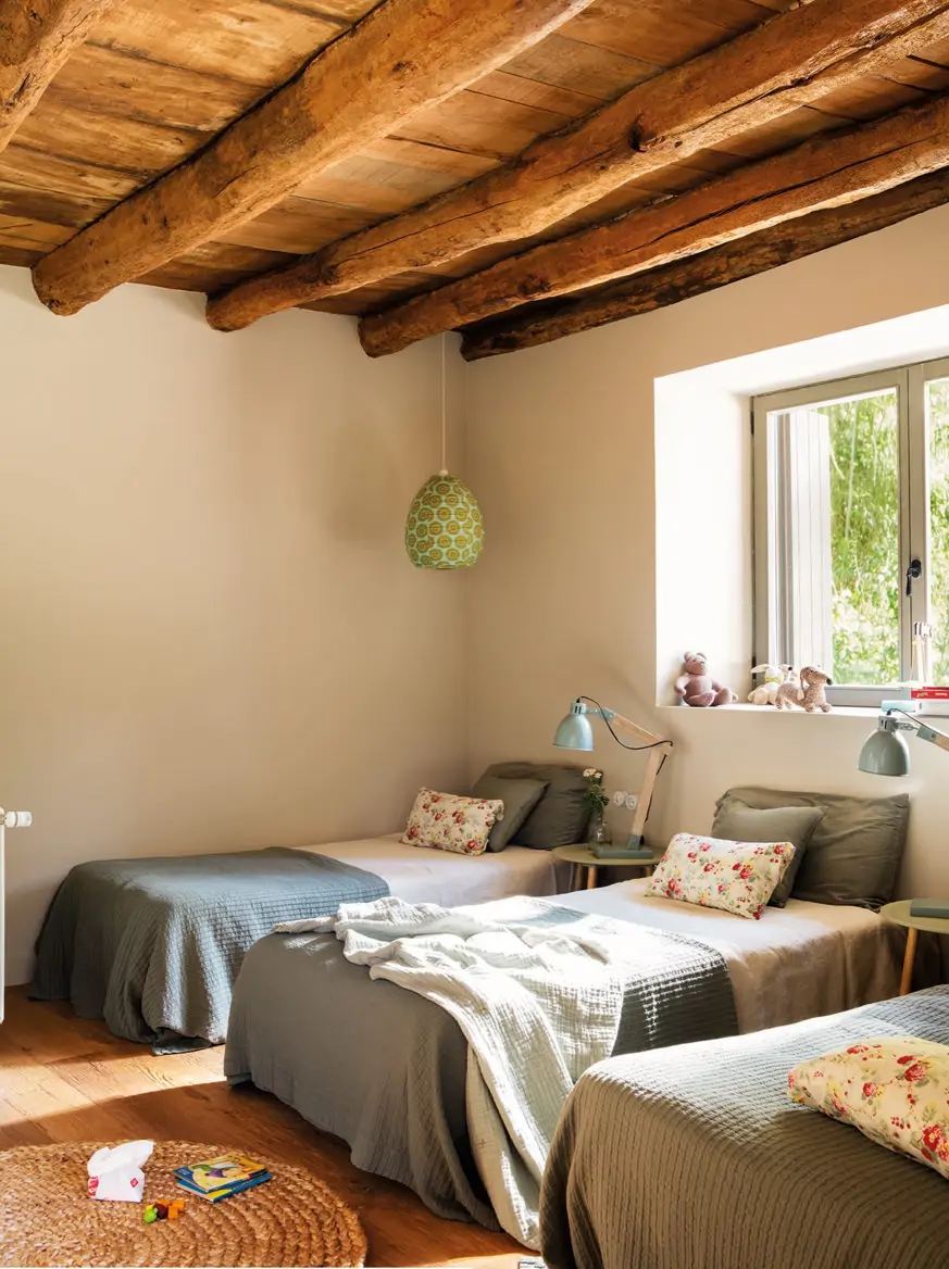 Vaikų kambarys su trimis lovomis yra dekoruotas pagal tą pačią spalvų gamą ir išvengta pertekliaus. Paprastas ir jaukus, jis yra tobulas ir turi aiškių šiaurietiškų niuansų, kaip matome iš naktinių staliukų ir ant jų esančių lempų.