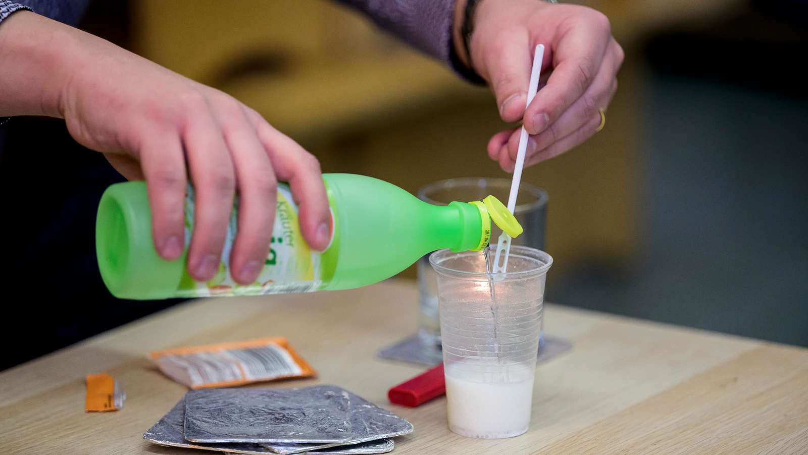 Pasidarykite tirštą pastą (milteliai + vanduo) arba praskieskite skystį.